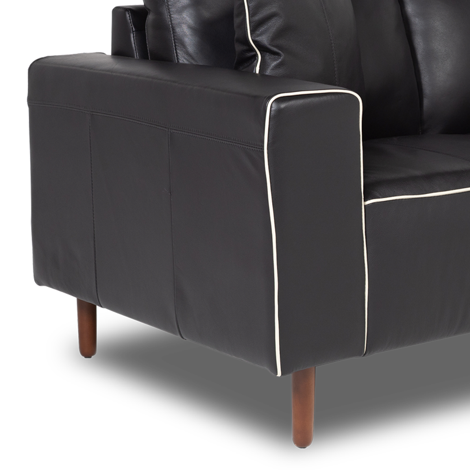 Une sofisticação e conforto. Estrutura em madeira de reflorestamento, assento com molas Nosag e espuma D30, encosto em fibra siliconada e braços em espuma D26. Almofada decorativa em couro legítimo, revestimento em couro legítimo com debrum e pés em madeira tingida garantem elegância e aconchego.