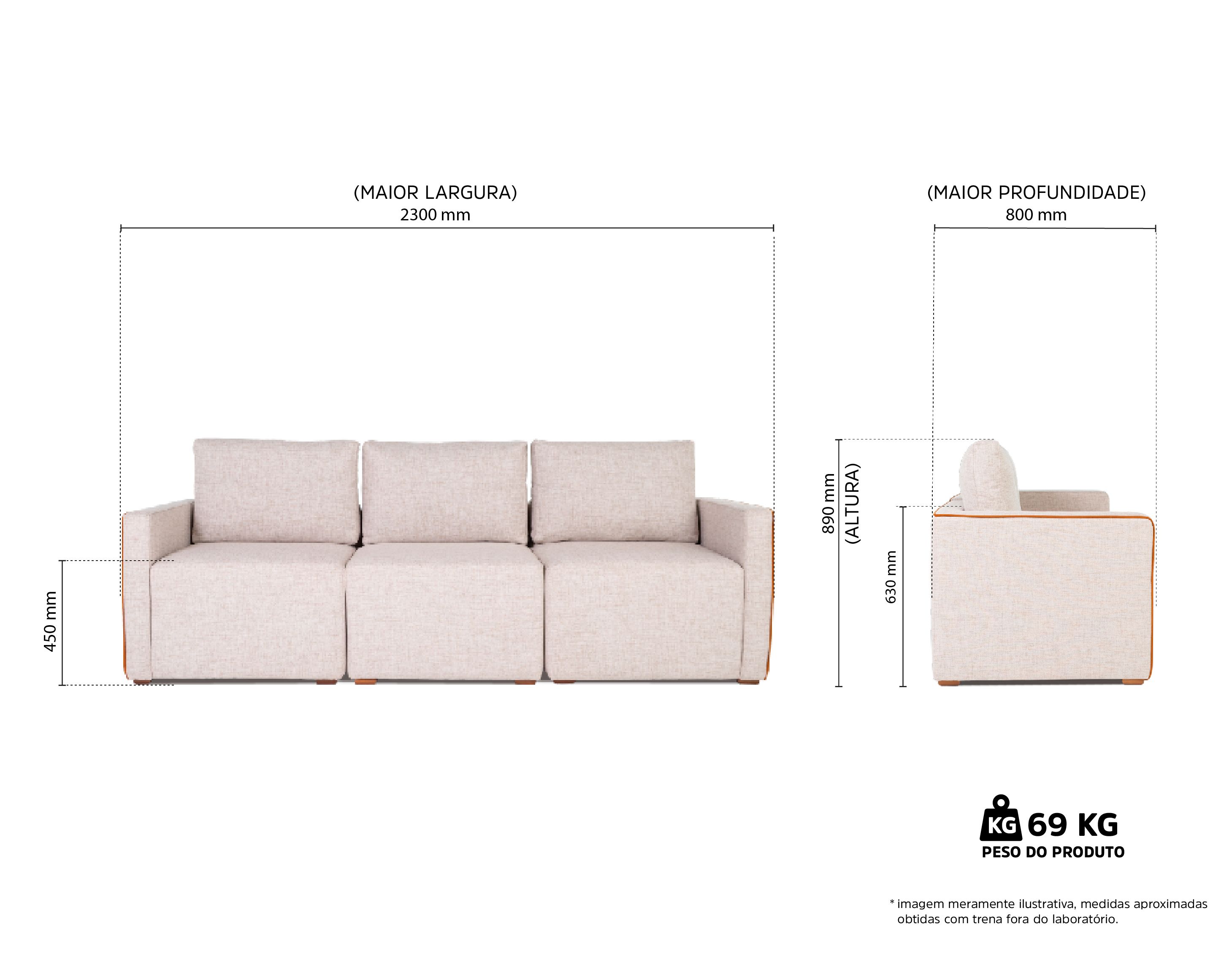 2300 x 800 x 630 mm (Largura x Profundidade x Altura)