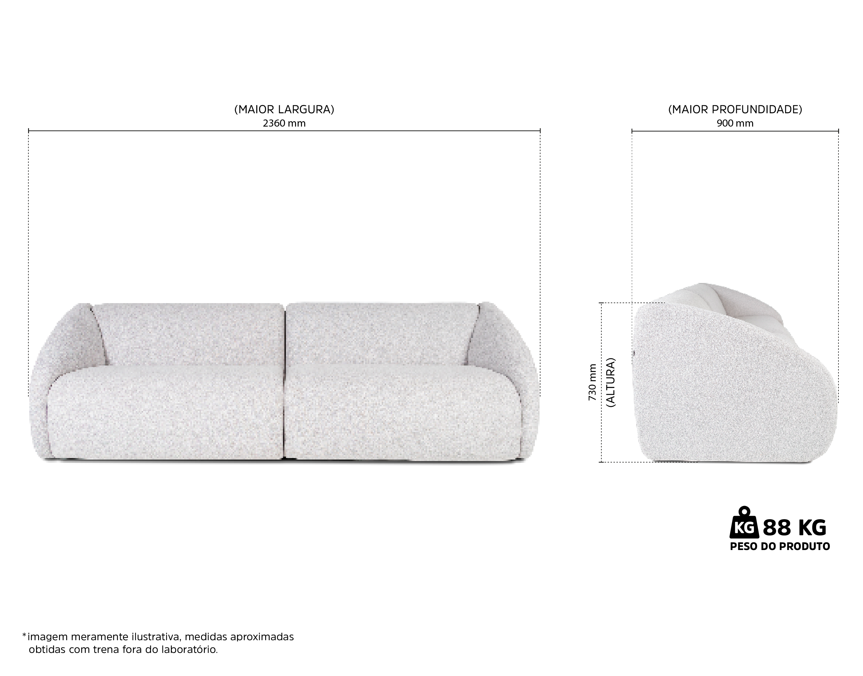 2360 x 900 x 730 mm (Largura x Profundidade x Altura)